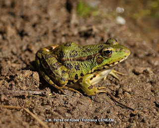 Pelophylax perezi sp.) es más pequeña que otras ranas y permanece toda la vida en zonas de agua, por eso tiene membranas en las patas traseras para nadar. Es el más ruidoso de nuestros anfibios, pudiendo escucharse los coros de machos a gran distancia. En su medio, la culebra de collar es un formidable enemigo. También son un plato exquisito para cigüeñas y garzas. Puede hibridarse con otras especies dando individuos con características intermedias.